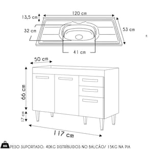 Balcão: 117 cm x 83 cm x 50 cm.