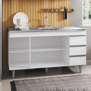 Modernidade não vai faltar no Balcão Gabinete Andréia, já que seu design com linhas retas e puxadores cava metálicos são atemporais, ou seja, nunca saem de moda. Já a versatilidade fica por conta da parte interna espaçosa com 1 prateleira e também das 3 gavetas que ajudam a manter os itens importantes sempre às mãos. Para completar, a pia inox 150cm é a escolha certa para um acabamento de qualidade e resistente, isso porque esse tampo de pia inox possui forro concretado e escorredor duplo e, ainda, acompanha a válvula com ralo o que facilita o escoamento de água ao passo que retém os detritos, evitando assim, que cheguem ao encanamento.