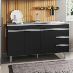 Modernidade não vai faltar no Balcão Gabinete Andréia, já que seu design com linhas retas e puxadores cava metálicos são atemporais, ou seja, nunca saem de moda. Já a versatilidade fica por conta da parte interna espaçosa com 1 prateleira e também das 3 gavetas que ajudam a manter os itens importantes sempre às mãos. Para completar, a pia inox 150cm é a escolha certa para um acabamento de qualidade e resistente, isso porque esse tampo de pia inox possui forro concretado e escorredor duplo e, ainda, acompanha a válvula com ralo o que facilita o escoamento de água ao passo que retém os detritos, evitando assim, que cheguem ao encanamento.