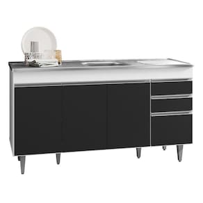 Quanto ao acabamento e estrutura também não há o que questionar, porque é fabricado em MDP 15mm com acabamento BP e os puxadores em alumínio modelo cava dão um toque de modernidade. Para completar, o tampo de pia em inox agrega ainda mais utilidade, pois você terá um espaço ideal para o preparo das refeições, além da cuba central ser ampla e acompanhar a válvula com ralo que servirá de peneira para resíduos, evitando assim, eventuais entupimentos no encanamento da pia.