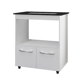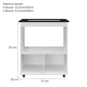Características: Estrutura em MDP Acabamento em pintura UV 02 Portas com Dobradiças Metálicas Puxadores em Plástico Cromados Altura dos Pés 5 cm Pés fixo Amplo Espaço Interno para Organizar Utensílios Nicho para Forno ou Microondas Abertura do tampo: 4 Bocas 53,5cm X 36cm / 5 Bocas 63,5cm X 36cm