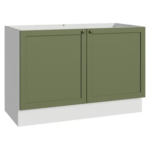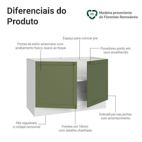 O acabamento de alta resistência da estrutura é em branco e das portas em Verde. Possui uma textura suave ao toque, trazendo leveza e sofisticação ao ambiente. O destaque fica por conta dos puxadores ponto em ouro envelhecido, feitos com metal resistente, trazem personalidade e um charme único. Outro diferencial está no detalhe chanfrado das frentes, que forma molduras elegantes e dá profundidade, refletindo o estilo americano com um toque moderno.