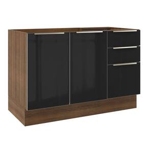 O móvel conta com duas portas com revestimento metálico, puxadores em alumínio, dobradiças com amortecimento e um lindo vidro preto sobreposto.