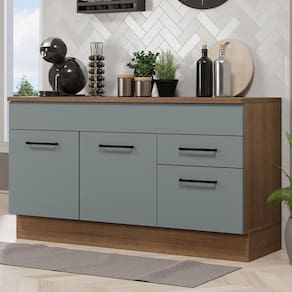 O móvel ainda acompanha tampo em MDP, que pode ser removido para a colocação de pia de inox ou pedra no tamanho de 150 cm de largura x 52 cm de profundidade.