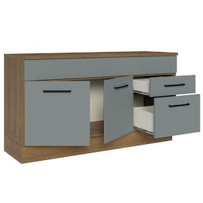 O acabamento da estrutura é em amadeirado Rustic e o das portas e frentes é cinza. É feito em Pintura Poliéster com 7 camadas que protegem o móvel dos efeitos do álcool da água e do calor.