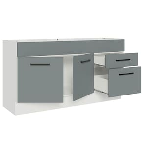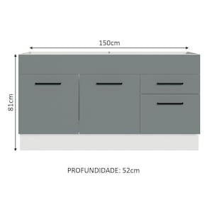 O acabamento da estrutura é branco e o das portas e frentes das gavetas é cinza. É feito em Pintura Poliéster com sete camadas, um método ecológico e que protege o móvel dos efeitos da água e do calor.