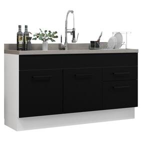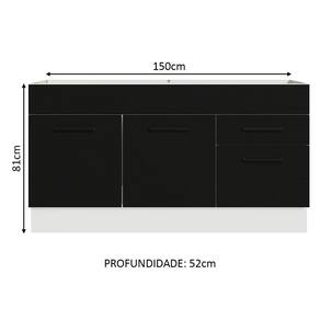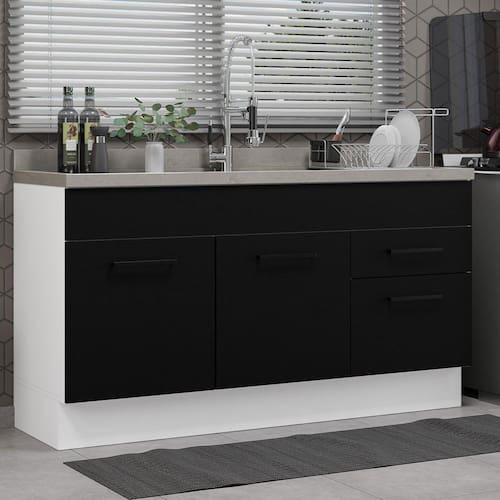 O acabamento da estrutura é branco e o das portas e frentes das gavetas é preto. É feito em Pintura Poliéster com sete camadas, um método ecológico e que protege o móvel dos efeitos da água e do calor.
