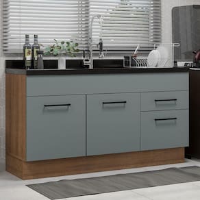 O acabamento da estrutura é em amadeirado Rustic e o das portas e frentes das gavetas é cinza. É feito em Pintura Poliéster com sete camadas, um método ecológico e que protege o móvel dos efeitos da água e do calor.