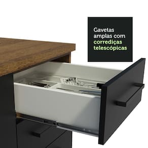 O acabamento da estrutura é em amadeirado Rustic e o das portas e frentes das gavetas é preto. É feito em Pintura Poliéster com sete camadas, um método ecológico e que protege o móvel dos efeitos da água e do calor.