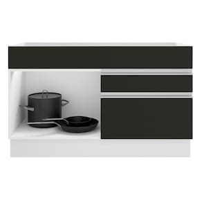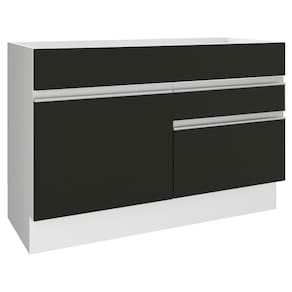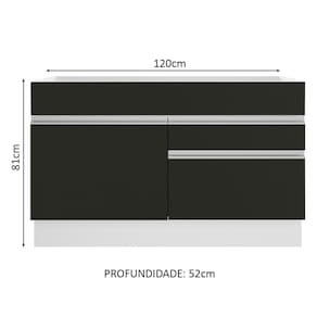 - Um (1) balcão de 81 cm de altura x 120 cm de largura x 52 cm de profundidade com uma (1) porta e duas (2) gavetas. (Não acompanha tampo.)