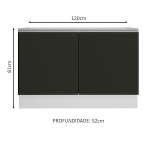 Possui duas portas e um interno com prateleira e duas divisórias. Assim fica muito mais fácil de organizar panelas, utensílios, louças e produtos de limpeza. O espaço para a colocação de tampo ou pia é de 120 cm de largura por 52 cm de profundidade.
