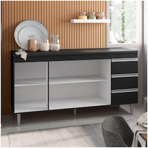 O Balcão é uma peça muito importante na cozinha, e ele possui estrutura em MDP e acabamento em pintura UV, ou seja, é uma ótima alternativa para os fãs de durabilidade e resistência. Além disso, ele também apresenta 3 portas convencionais e 3 gavetas de deslize suave e amplo espaço interno para guardar seus utensílios, te auxiliar e deixar sua rotina ainda mais dinâmica. Tudo de bom, né?