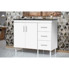 Balcão Gabinete Multiuso 2 Portas 3 Gavetas Canadense O Balcão Canadense possui design moderno, ótimo para quem está precisando otimizar espaço na cozinha. Fabricado em MDP e tampo de 15mm, 2 portas com dobradiças metálicas, 1 prateleira interna, 3 gavetas com corrediças telescópicas, possui puxadores e pés em plástico. Balcão prático e com design perfeito, amplo espaço para guardar alimentos, panelas, talheres e até produtos de limpeza.