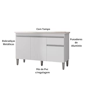 Características do ProdutoMaterial da Estrutura: 100% MDPPeso Suportado: 28 Kg distribuídosPossui Tampo: SimAcabamento: Pintura UVPossui Portas: SimQuantidade de Portas: 3 PortasMaterial da Porta: MDPTipo de Porta: ConvencionalPossui Gavetas: SimPossui Puxadores: SimTipo de Puxador: CavaMaterial dos Puxadores: PVCPossui Pés: Sim