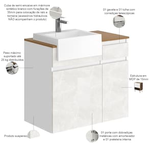 Esse balcão suspenso é fabricado com materiais de qualidade, o que confere ótima durabilidade, acabamento e resistência. Além disso, se você busca por um balcão de banheiro eficiente na organização dos itens, esse oferece excelente repartição interna, com uma prateleira interna, além de uma gaveta e uma tulha para roupas sujas. Em outras palavras, chega de bagunça no banheiro e de roupas espalhadas pelo chão. Não perca a chance de deixar seu cômodo ainda mais lindo e charmoso com o gabinete com cuba Moira!
