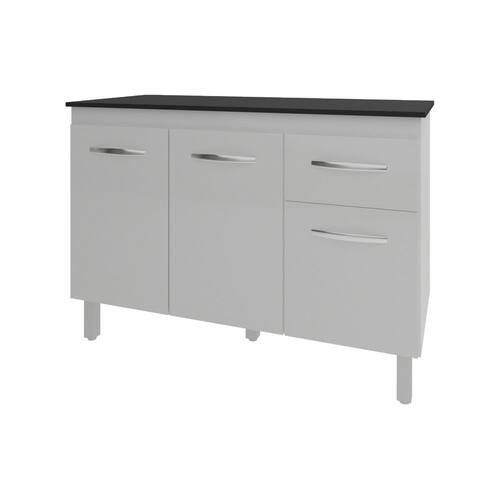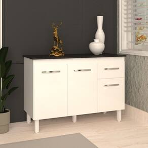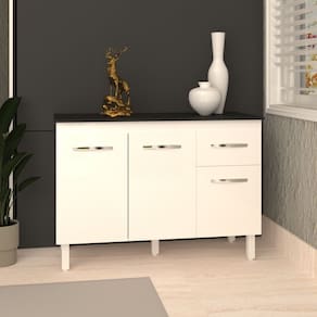 Altura com os pés: 83,5 cm Altura sem os pés: 67 cm Largura: 118 cm Profundidade: 50 cm Material: MDP (madeira) Portas: 3 portas Gavetas: 1 gaveta Prateleiras: 1 prateleira Puxadores: 4 puxadores plásticos cromados Pés: 5 pés reguláveis de plástico Altura dos pés: 16,5 cm Regulagem dos pés: Somente para nivelamento, até 18 cm Corrediças: Metálicas Indicações de Uso: Cozinha