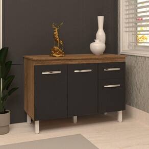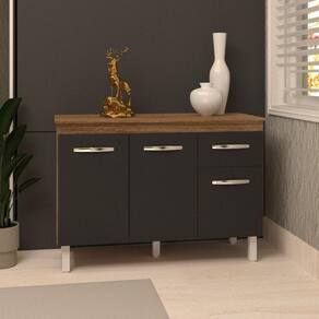 Altura com os pés: 83,5 cm Altura sem os pés: 67 cm Largura: 118 cm Profundidade: 50 cm Material: MDP (madeira) Portas: 3 portas Gavetas: 1 gaveta Prateleiras: 1 prateleira Puxadores: 4 puxadores plásticos cromados Pés: 5 pés reguláveis de plástico Altura dos pés: 16,5 cm Regulagem dos pés: Somente para nivelamento, até 18 cm Corrediças: Metálicas Indicações de Uso: Cozinha