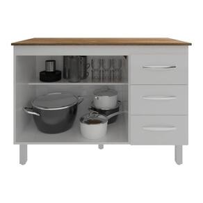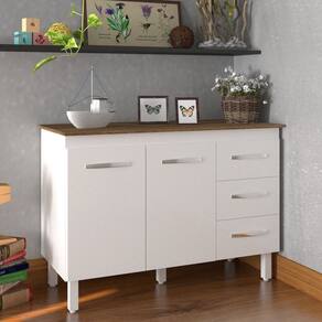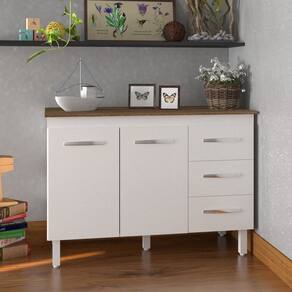 Altura com os pés: 83,5 cm Altura sem os pés: 67 cm Largura: 118 cm Profundidade: 50 cm Material: MDP (madeira) Portas: 2 portas Gavetas: 3 gavetas Prateleiras: 1 prateleira Puxadores: 5 puxadores plásticos cromados Pés: 5 pés reguláveis de plástico Altura dos pés: 16,5 cm Regulagem dos pés: Somente para nivelamento, até 18 cm Corrediças: Metálicas Indicações de Uso: Cozinha