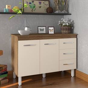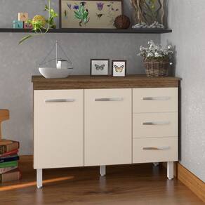 Altura com os pés: 83,5 cm Altura sem os pés: 67 cm Largura: 118 cm Profundidade: 50 cm Material: MDP (madeira) Portas: 2 portas Gavetas: 3 gavetas Prateleiras: 1 prateleira Puxadores: 5 puxadores plásticos cromados Pés: 5 pés reguláveis de plástico Altura dos pés: 16,5 cm Regulagem dos pés: Somente para nivelamento, até 18 cm Corrediças: Metálicas Indicações de Uso: Cozinha
