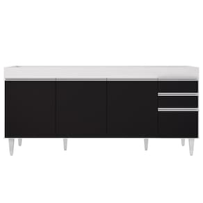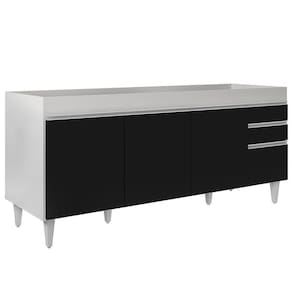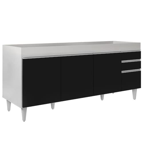 Fabricado em MDP com acabamento em pintura UV, oBalcão Gabinete Dallas Branco/Preto é uma excelente opção para quem tem umacozinha com amplo espaço disponível para louça, panelas e demais acessórios utilizados neste ambiente que podem ser aproveitados da melhor maneira. Além da estrutura, também conta com pés reguláveis em PVC, 3 portas convencionais, 1 porta basculante com puxador em alumínio embutido e 1 prateleira interna. Além é claro, de 2 gavetas na lateral também com puxadores embutidos para facilitar o manuseio e com corrediças metálicas e espaço ótimo para guardar seus talheres e utensílios. Ah, não possui tampo, mas pode formar conjunto com tampo ou pia vendidos separadamente.