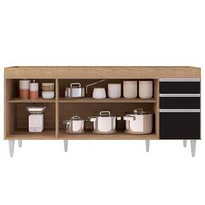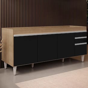 Fabricado em MDP com acabamento em pintura UV, o Balcão Gabinete Dallas Castanho/Preto é uma excelente opção para quem tem uma cozinha com amplo espaço disponível para louça, panelas e demais acessórios utilizados neste ambiente que podem ser aproveitados da melhor maneira. Além da estrutura, também conta com pés reguláveis em PVC, 4 portas convencionais com puxador em alumínio embutido e 1 prateleira interna. Além é claro, de 2 gavetas na lateral também com puxadores embutidos para facilitar o manuseio e com corrediças metálicas e espaço ótimo para guardar seus talheres e utensílios. Ah, não possui tampo, mas pode formar conjunto com tampo ou pia vendidos separadamente.