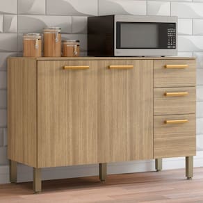 A Cozinha é um dos principais cômodos da casa, afinal é onde preparamos as refeições e nos reunimos para compartilhá-las, por isso, ter uma Balcão de Cozinha que seja bonito e resistente é super importante. Pensando nisso, apresentamos o Balcão Gabinete com Tampo, o seu design clean combina com vários estilos de decoração e sua estrutura é produzida em MDP 12 e 15mm e acabamento com pintura UV. Além disso, conta com 3 portas com dobradiças 100% metálicas e 2 gavetas com corrediças telescópicas que deslizam suavemente. Ah! Ainda acompanha um Tampo para você dispor dos utensílios que mais utiliza para facilitar o seu dia a dia.