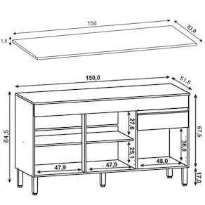Balcão: 150 cm x 84,5 cm x 51,8 cm.