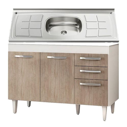 Balcão Gabinete Suécia e Pia Inox 120cm 3 Portas - Lumil Móveis, perfeito para complementar sua cozinha e organizar seus utensílios. Estrutura em MDP/MDF com revestimento em BP resultando em um acabamento resistente, contém 03 portas, 02 gavetas, pés reguláveis que facilitam a posição do móvel e acompanha pia inox com cuba central, escorredor duplo, forro em concreto e válvula cromada que facilita no escoamento de água e retém resíduos. Confira e leve já!