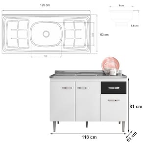 Balcão Gabriela com Pia e Cuba GhelPlus 120cm Branco Preto AJL Móveis