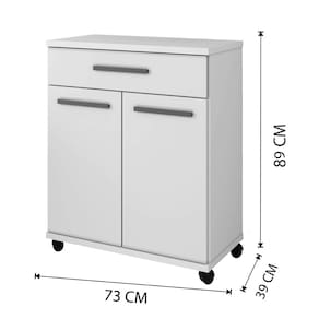 Invista em móveis que ofereçam praticidade, sofisticação e qualidade. Como o Balcão Londrina. Desenvolvido com materiais de alto padrão, super-resistente, garante toda durabilidade e qualidade. Espaçoso para você guardar seus utensílios domésticos, otimizar espaço e ainda deixar o ambiente organizado. Com opção de gaveta nas cores branca ou preta, ele vai combinar perfeitamente com a sua cozinha, fazendo dela um ambiente muito mais bonito e prático.\nEspecificações do Produto Montado: Altura: 89 cm Largura: 73 cm Profundidade: 39 cm Peso: 27Kg \nGarantia: 3 meses Número de Portas: 02 Número de Gavetas: 01 Número de Prateleiras: 02 Rodizio incluso: Sim.\nObservações: Não oferecemos serviço de montagem, mas todos os produtos possuem manual de montagem com o passo a passo. Recomendamos contratar um profissional de montagem. Pode existir alguma diferença de tonalidade entre a foto e o produto, devido ao tratamento de imagens e à calibração de cores do monitor.