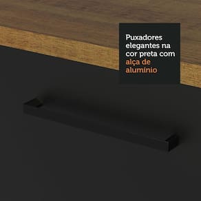 É desenvolvido com materiais de alta qualidade, como puxadores com alça de alumínio e dobradiças metálicas com amortecimento. O balcão acompanha tampo em pintura Rustic, que pode ser recortado para colocação de cooktop. Além disso, conta com pés reguláveis em PVC e rodapé removível em MDP.