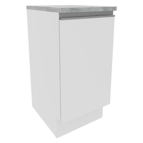 Possui uma porta convencional com puxador em alumínio e dobradiças metálicas com amortecimento para o fechamento suave. Internamente tem uma prateleira e contempla o tampo do balcão. Os pés são em PVC com regulagem de altura e rodapé removível em MDP de fácil encaixe.