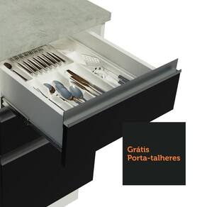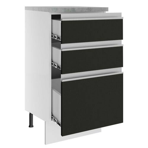 Possui 3 gavetas grandes, sendo a última mais profunda, com puxadores em alumínio e corrediças telescópicas que possibilitam a abertura total das gavetas. Possui pés em PVC com regulagem de altura e rodapé removível em MDP de fácil encaixe.