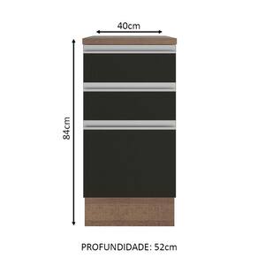 Possui 3 gavetas grandes, sendo a última mais profunda, com puxadores em alumínio e corrediças telescópicas que possibilitam a abertura total das gavetas. Possui pés em PVC com regulagem de altura e rodapé removível em MDP de fácil encaixe.