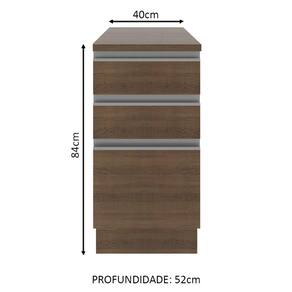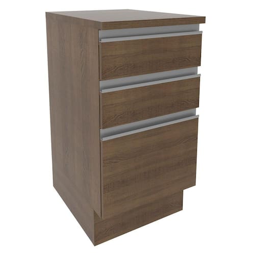 Possui 3 gavetas grandes, sendo a última mais profunda, com puxadores em alumínio e corrediças telescópicas que possibilitam a abertura total das gavetas. Possui pés em PVC com regulagem de altura e rodapé removível em MDP de fácil encaixe.