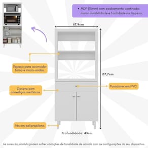 Organize sua cozinha de forma prática e eficiente com o Balcão Multiuso 67,9cm 2 Portas 1 Gaveta para Forno e Micro-ondas Multimóveis CR20344. Produzido em MDP de 15mm com pintura UV, garante durabilidade, resistência e sua matéria-prima é ecologicamente sustentável. Com área dedicada para forno e micro-ondas, 2 portas e 1 gaveta, você terá amplo espaço interno para armazenar mantimentos e utensílios mais altos. As corrediças metálicas oferecem maior leveza no manuseio, facilitando na hora de guardar seus talheres. Além disso, o balcão possui puxadores em ABS práticos e pés em PVC, que proporcionam estabilidade ao móvel.