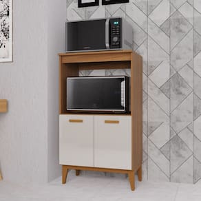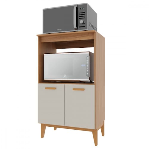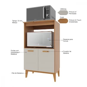 Características: - Espaço Forno/Micro-ondas: Alt 0,44 x Larg 0,62 x Prof 0,40 - Estrutura MDP 15mm - Tampo MDP 15mm - 1 prateira e 2 portas - Puxadores de sobrepor em madeira - Dobradiças metálicas - Pés de 20cm de trapézio em madeira maciça - Acabamento de Pintura: Fosco/Brilhante - Suporte de peso: 40kg distribuídos - Suporte de peso da prateleira: 15kg - Garantia de 6 meses