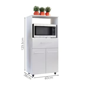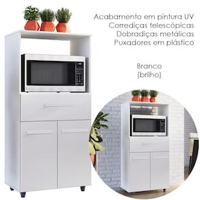 Balcão Multiuso Luna traz organização e praticidade para o seu dia a dia. Produzido em MDP (12/15 mm), com acabamento em pintura UV. Possui portas com dobradiças metálicas, gavetas com corrediças telescópicas, além de um nicho funcional para microondas/forno e puxadores e pés em plástico. Este produto será entregue em 01 volume.
