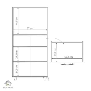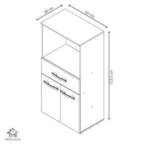 Suas dimensões são 123,5 cm de altura, 60 cm de largura e 38 cm de profundidade, com nicho para forno ou micro-ondas medindo 57 cm de largura por 40 cm de altura. Compacto e versátil, se adapta perfeitamente a diferentes ambientes. A montagem é simples e o manual acompanha o produto.