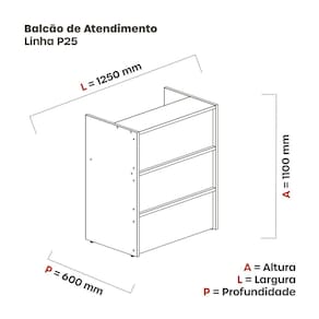 BALCÃO PARA RECEPÇÃO/ATENDIMENTO Tampo e pé MDPBP 25mm com bordas de PVC 2mm Painel frontal MDPBP 25mm com bordas de PVC 2mm e 0,45mm, ideal para recepcionar pacientes em clinicas ou clientes em conveniências. Acabamento da Prateleira: Melamínico Acabamento dos Pés: Polipropileno Altura: 110 cm Altura dos Pés: 3 cm Ambiente Principal: Escritório codigo_ean: 7909903371435 Complexidade da Montagem: Média: pode ser montado por mais de uma pessoa e/ou necessite de maior conhecimento para montagem Cor: Preto Cor do Produto: Preto Cor Interna: Preto Cor Predominante: Preto Escala de Brilho: Semi-Fosco Escala de Brilho da Prateleira: Semi-Fosco Estilo: Clássico Largura: 125 cm Linha ou Coleção: P25 Manual de Montagem e Instalação: https://product-hub-prd.madeiramadeira.com.br/652532/documents/620bc059-2266-44a7-9702-078e5319ca4f432848balcaodeatendimento1.pdf Material da Prateleira: MDP Possui Gavetas: Não Profundidade: 60 cm Suporta Até (kg): 30 kg Ean: 7909903371435