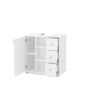 Características: Estrutura MDP Pintura UV 01 Porta articulada 03 Gavetas com corrediças metálicas Puxadores de Plástico Peso suportado na Prateleiras: 3kg Peso suportado nas Gavetas: 1kg