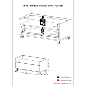 Esse módulo inferior é composto por 01 gaveta, produzido em 100% MDP de 15mm, possui rodízios com trava de segurança (02 rodízios com trava e 02 rodízios sem trava), é um produto versátil e super funcional, podendo ser usado em diversos ambientes, é perfeito para espaços restritos, e para complementar seu ambiente, auxiliando você na organização do banheiro, se usado abaixo da cuba, no quarto, se usado abaixo da escrivaninha, ou aonde você precisar de um espaço extra, para armazenar e organizar sua casa.