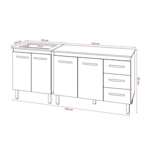 Altura com os pés: 83,5 cm Altura sem os pés: 67 cm Largura: 118 cm Profundidade: 50 cm Material: MDP (madeira) Portas: 3 portas Gavetas: 1 gaveta Prateleiras: 1 prateleira Puxadores: 4 puxadores plásticos cromados Pés: 5 pés reguláveis de plástico Altura dos pés: 16,5 cm Regulagem dos pés: Somente para nivelamento, até 18 cm Corrediças: Metálicas Indicações de Uso: Cozinha