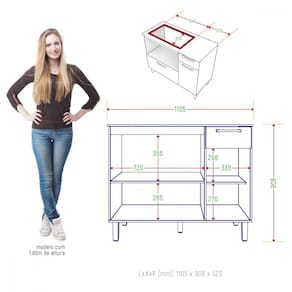 Altura: 90 cm Largura: 110 cm Profundidade: 52 cm 100 MDP de 15 mm Espaço cooktop 640X370 Espaço forno 720x355 Corrediça metálica Dobradiça metálica, sendo uma porta bascular com articulador Puxador de plástico 05 Pés de plástico com regulagem Acabamento/Pintura Texturizado UV Verniz Fosco Suporte de peso 34 kg Garantia 03 meses
