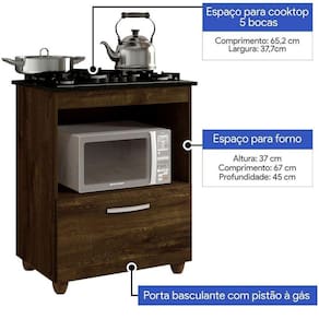 Especificações Tecnicas: Material da estrutura: MDP Acabamento: Pintura U.V Fosco Número de Porta: 1 Número de Gaveta: Não Possui Número de Prateleira: Não Possui Material do puxador: Plástico Material dos Pés: Plástico Altura dos Pés: 5cm Material da corrediça: Não Possui Material da dobradiça: Métalica Tipo de porta: Basculante Possui recorte para Cooktop: Sim Medida do Recorte para Cooktop: 65,2cmx37,7cm. Peso máximo que suporta: 55kg Necessita montagem: Sim