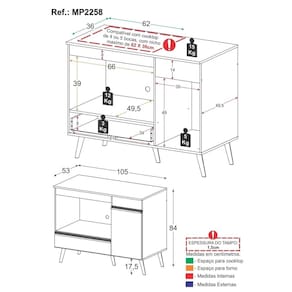 Especificações Técnicas: Dimensões do Produto Montado - Altura: 84cm | Largura: 105cm | Profundidade: 53cm Espaço para Forno - Altura: 39cm | Largura: 66cm | Profundidade: 49,5cm Material: MDP Acabamento: Acetinado Puxadores: ABS Pés: Polipropileno Corrediças: Metálicas Compatível com Cooktop: Sim (tampo não recortado) Nicho para Forno: Sim