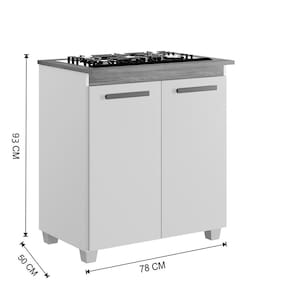 Balcão para CookTop de 5 bocas Fox é um produto compacto que pode ser utilizado como complemento de cozinha ou peça única, possui amplo espaço interno para melhor armazenar os seus utensílios. Com suas duas portas e prateleiras internas ele te ajudará a deixar sua cozinha mais organizada e bonita.\nIDEAL PARA COOKTOP DE 5 BOCAS\nEspecificações do Produto Montado: Altura: 93 cm Largura: 78 cm Profundidade: 50 cm Dimensões do corte: 63,5 x 35,0 Peso: 28Kg Quantidade de Volume: 1\nGarantia: 3 meses Material da estrutura: MDF 15mm Número de Portas: 02 Número de Prateleiras: 02 Rodizio incluso: Não\nObservações: Não oferecemos serviço de montagem, mas todos os produtos possuem manual de montagem com o passo a passo. Recomendamos contratar um profissional de montagem. Pode existir alguma diferença de tonalidade entre a foto e o produto, devido ao tratamento de imagens e à calibração de cores do monitor