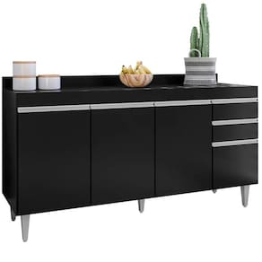 Seu tampo resistente oferece uma superfície prática para apoiar eletrodomésticos, utensílios ou itens decorativos, enquanto as três portas garantem amplo espaço interno para armazenar panelas, mantimentos e acessórios, mantendo tudo sempre em ordem e ao alcance das mãos.