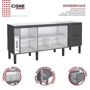 DIMENSÕES DO PRODUTO - Largura: 194 cm - Altura: 85 cm - Profundidade: 51 cm Características técnicas: - Produto: Gabinete (DESMONTADO) - Modelo: Cisne - Marca: Cozimax - Porta condimentos: Sim - Quantidade de portas: 3 - Quantidade de gavetas: 3 (1 das Gaveta é oculta) - Porta condimentos: 1 - Possui prateleira interna: Sim - Possui divisória interna: Sim - Estrutura: Madeira MDP - Puxadores: Aço Galvanizado - Pés: Polipropileno virgem e com regulagem de altura - Dobradiças: Sistema de amortecimento (slow) - Corrediças: Telescópicas com abertura total - Possui fundo: Sim - Possui passagem para sifão: Não - Possui divisor de talheres: Não - Acompanha Pia ou Tampo: Não - Garantia: 3 meses Suporta Granito: Sim Acabamento da Prateleira: Pintura Escala de Brilho da Prateleira: Fosco Acabamento da Gaveta: Pintura Material do Puxador da Gaveta: Metal Acabamento da Porta: Pintura Escala de Brilho da Porta: Fosco Produto Montado: Sim Acabamento: Pintura Acompanha Tampo: Não Altura dos Pés: 21 cm Altura Máxima dos Pés: 21.0000 Ambiente Principal: Cozinha Balcão Acompanha Pia: Não codigo_ean: 7908308766419 Complexidade da Montagem: Média: pode ser montado por mais de uma pessoa e/ou necessite de maior conhecimento para montagem Cor: Preto Cor do Produto: Preto Escala de Brilho: Fosco Gaveta com Chave: Não Itens Inclusos: 1 balcão, manual de montagem e kit ferragens Manual de Montagem e Instalação: https://product-hub-prd.madeiramadeira.com.br/837718/documents/fe3f937a-be6c-4afb-90a7-61feaa799c4dgabinete17411941desmontado.pdf Material da Dobradiça/Corrediça da Porta: Metálica Material da Gaveta: MDP Material da Porta: MDP Material da Prateleira: MDP Material dos Pés: Polipropileno Necessita Montagem: Sim O Balcão Acompanha Pia: Não Origem do Produto: Nacional Pés Reguláveis: Sim Peso: 59 kg Peso Máximo por Gaveta: 5 kg Peso Máximo por Prateleira: 5 kg Possui Pés: 06 Possui recorte para Cooktop: Não Recomendações de Uso, Manutenção e Limpeza: Pano umedecido Sapatas Niveladoras: Sim Sistema de Montagem: Parafusos Suporta Até (kg): 110 kg Tipo de Corrediça da Gaveta: Telescópica Tipo de Dobradiça/Corrediça da Porta: Simples Tipo de Porta: Bater Tipo de Puxador da Gaveta: Externo Tipo de Puxador da Porta: Externo