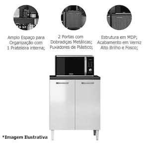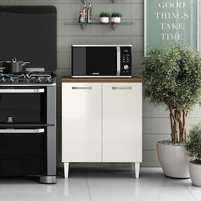 Característica do Balcão para Cozinha 70cm 2 Portas Halena: - Estrutura em MDP; - 2 Portas com dobradiças metálicas; - Puxadores de Plástico; - Acabamento em verniz texturizado; - Não acompanha objetos decorativos; - Montagem por conta do comprador;